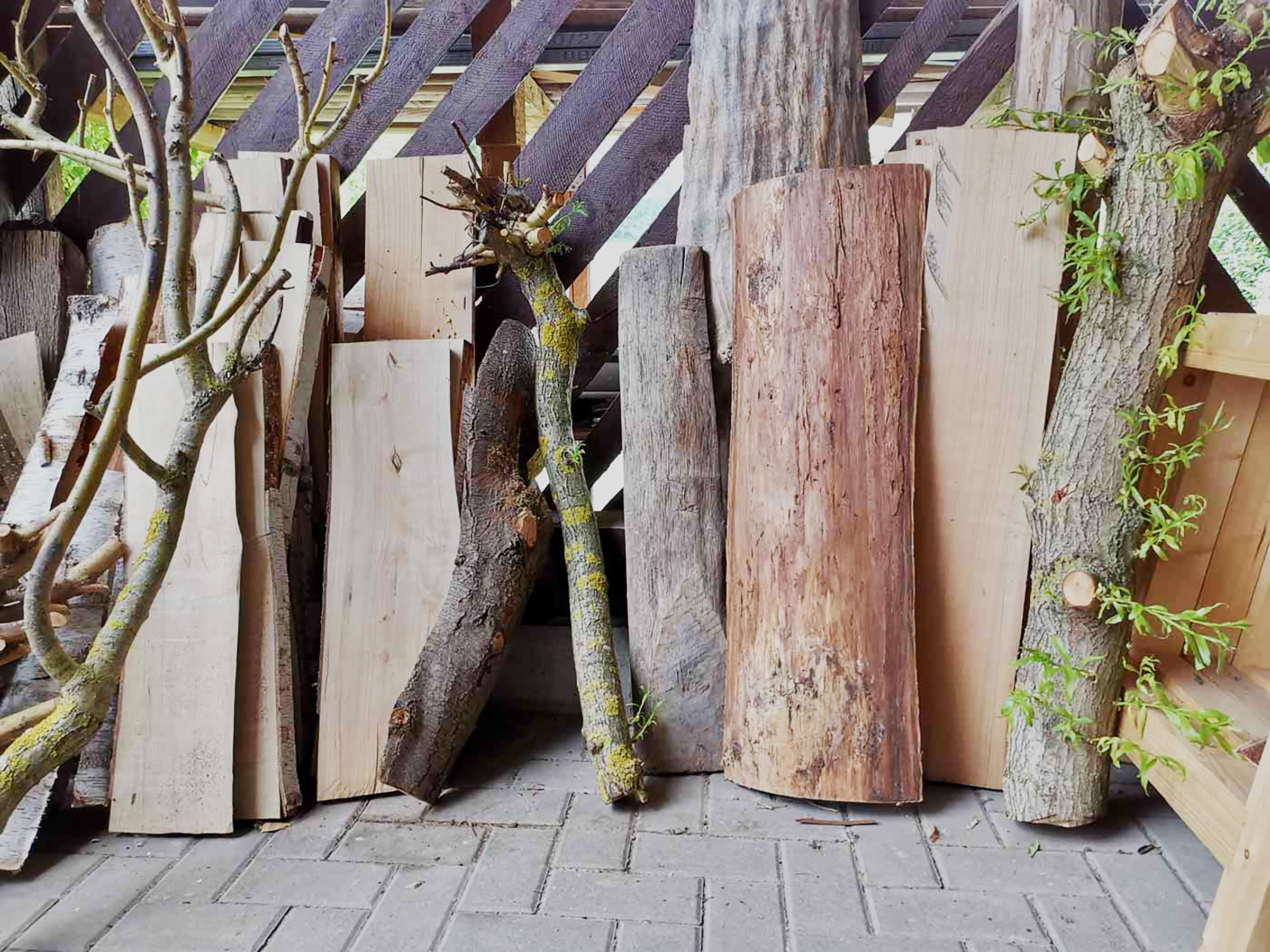 Wenn dieser Baum fällt und ich ein Stück von ihm mit nach Hause nehme, nehme ich das alles mit. Das klingt nach Schwere. Ist es aber nicht — oder jedenfalls nicht nur. Es ist auch eine Art Würde, die das Holz in sich trägt. Eine Substanz. Und auf dieser Substanz kann man etwas Leichtes wagen, ohne dass es beliebig wirkt.